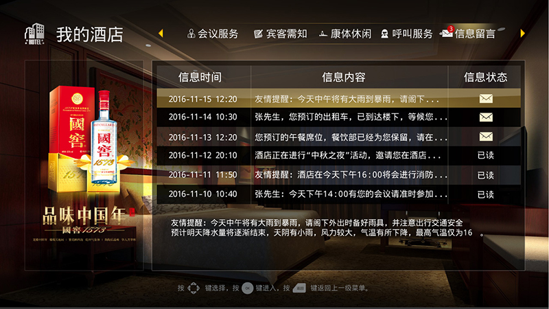 快速退房服務:酒店高效率服務無不受到顧客稱贊,用戶在客房按下退房開關時直接可以辦理退房手續,通知服務人員對客房進行檢查,結束后打印帳單,用戶下樓買單離去,期間無需排隊等待。
